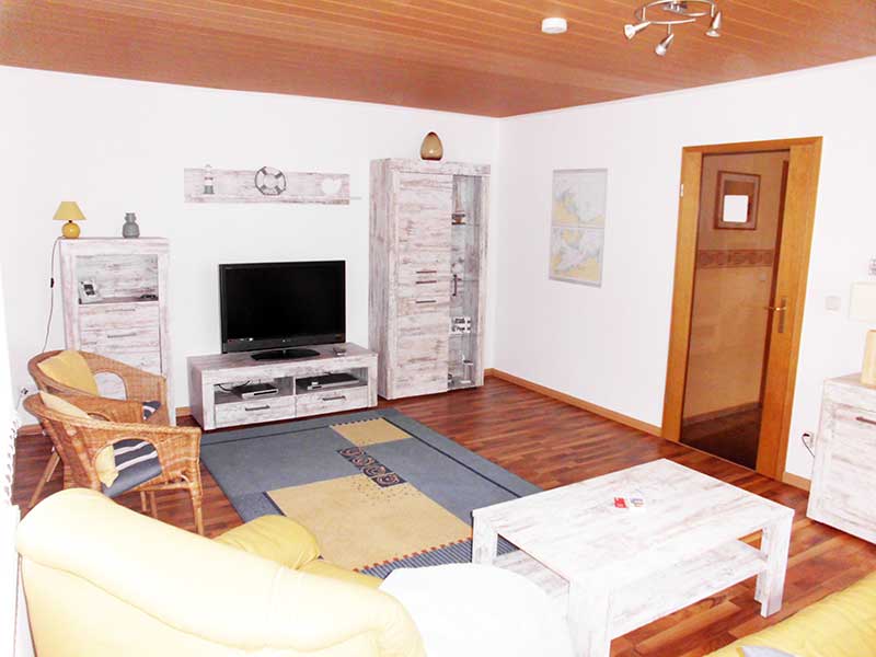 - großen Wohnzimmer (Doppelbettcouch, Anbauwand, Sideboard, Sat-Fernseher und Stereoanlage)